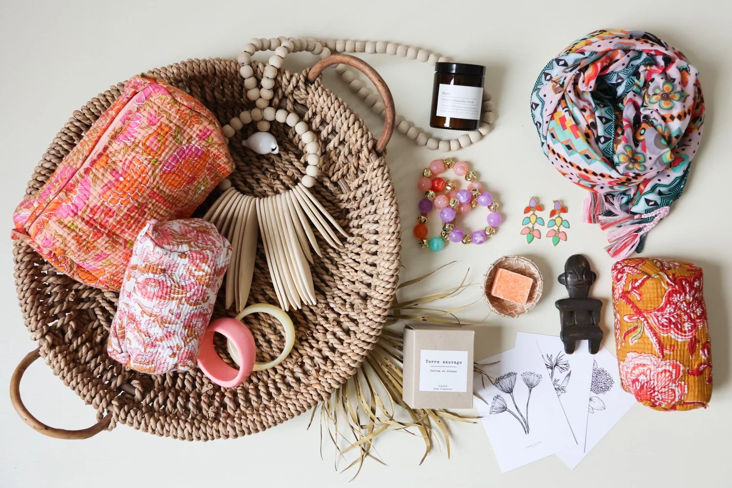 Des idées cadeaux bohèmes, entre bijoux colorés en acier inoxydable, trousses confectionnées en Inde, bougies et foulards imprimés au charme unique.